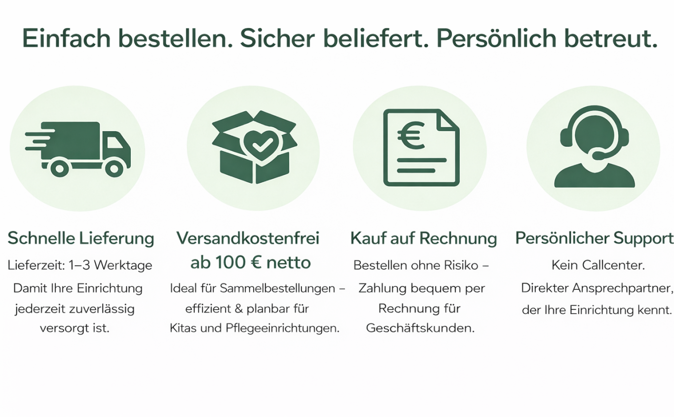 Unser Sortiment reicht von Nitrilhandschuhen und Desinfektionsmitteln bis zu Reinigungs- und Wischtüchern – alles aus einer Hand, speziell abgestimmt auf den Alltag in Kindertagesstätten.